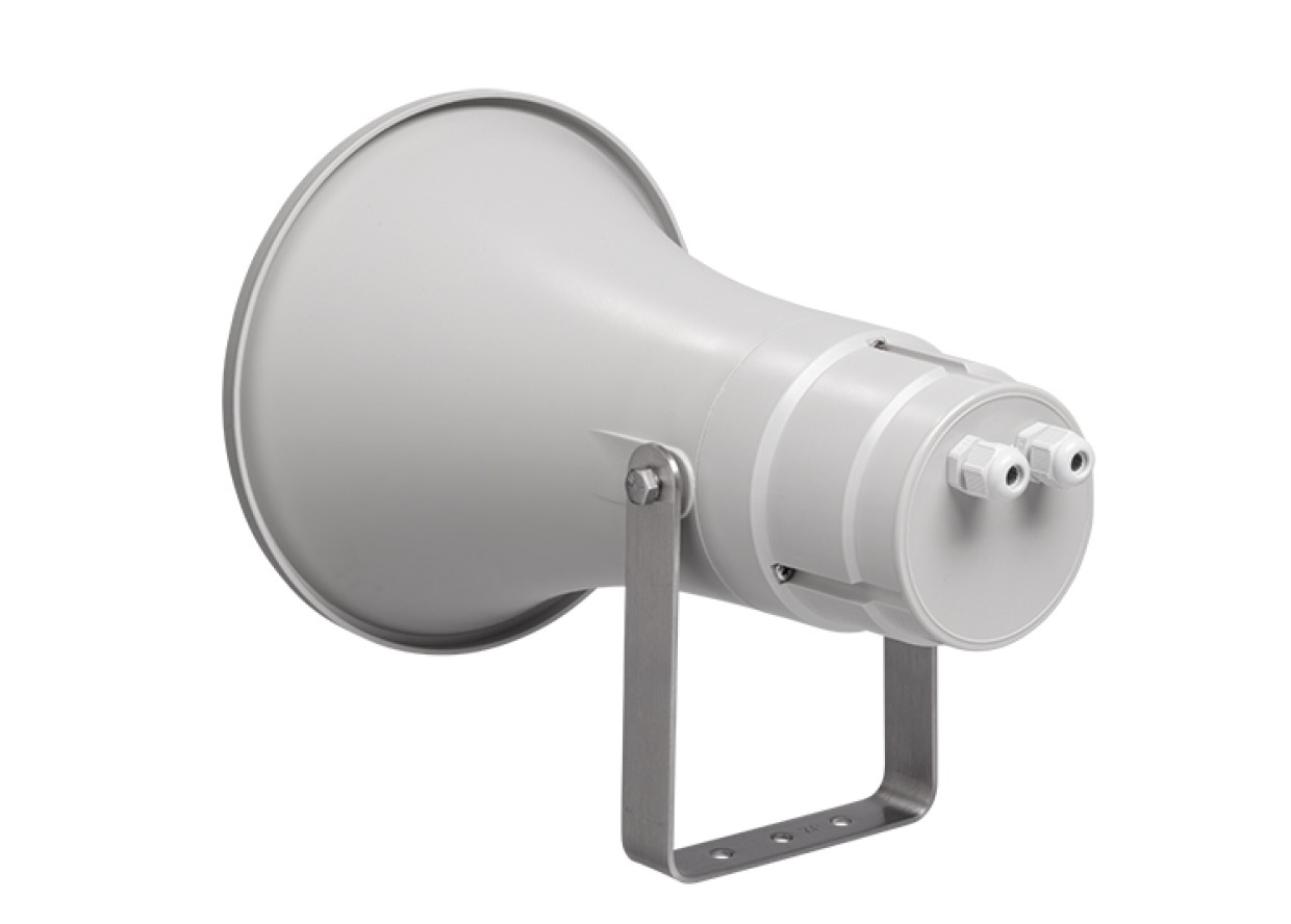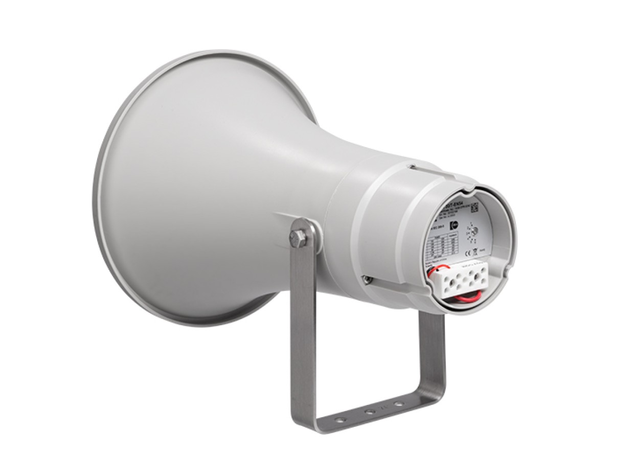 Weatherproof horn speaker for voice alarm applications, certified according to EN 54-24, suitable for industrial indoor and outdoor use with high sound pressure level.