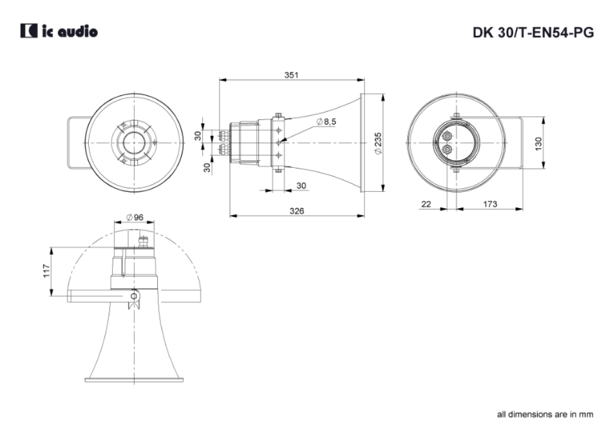 30/20/10/5 (20) WTyp B-25 / +70 C°Weatherproof horn speaker for voice alarm applications, certified according to EN 54-24, suitable for industrial indoor and outdoor use with high sound pressure level.